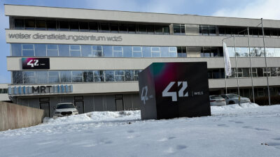 - Beschriftung "42 | WELS" weiß leuchtend